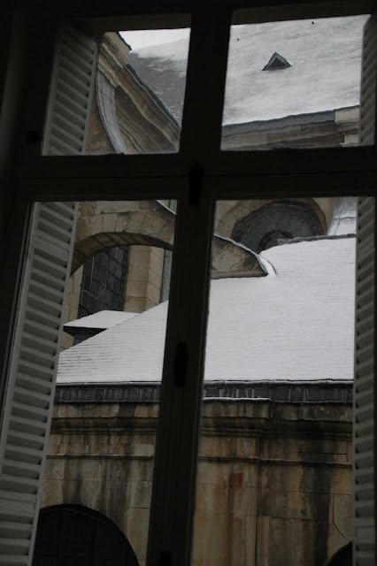 Snow in Paris... sur le toit de l'Eglise Saint Roch This morning when we woke up, this is the view from our apartment window looking out on Saint-Roch. The many surfaces of the roof were coated in white. What a beautiful winter scene in Paris!Bon dimanche...